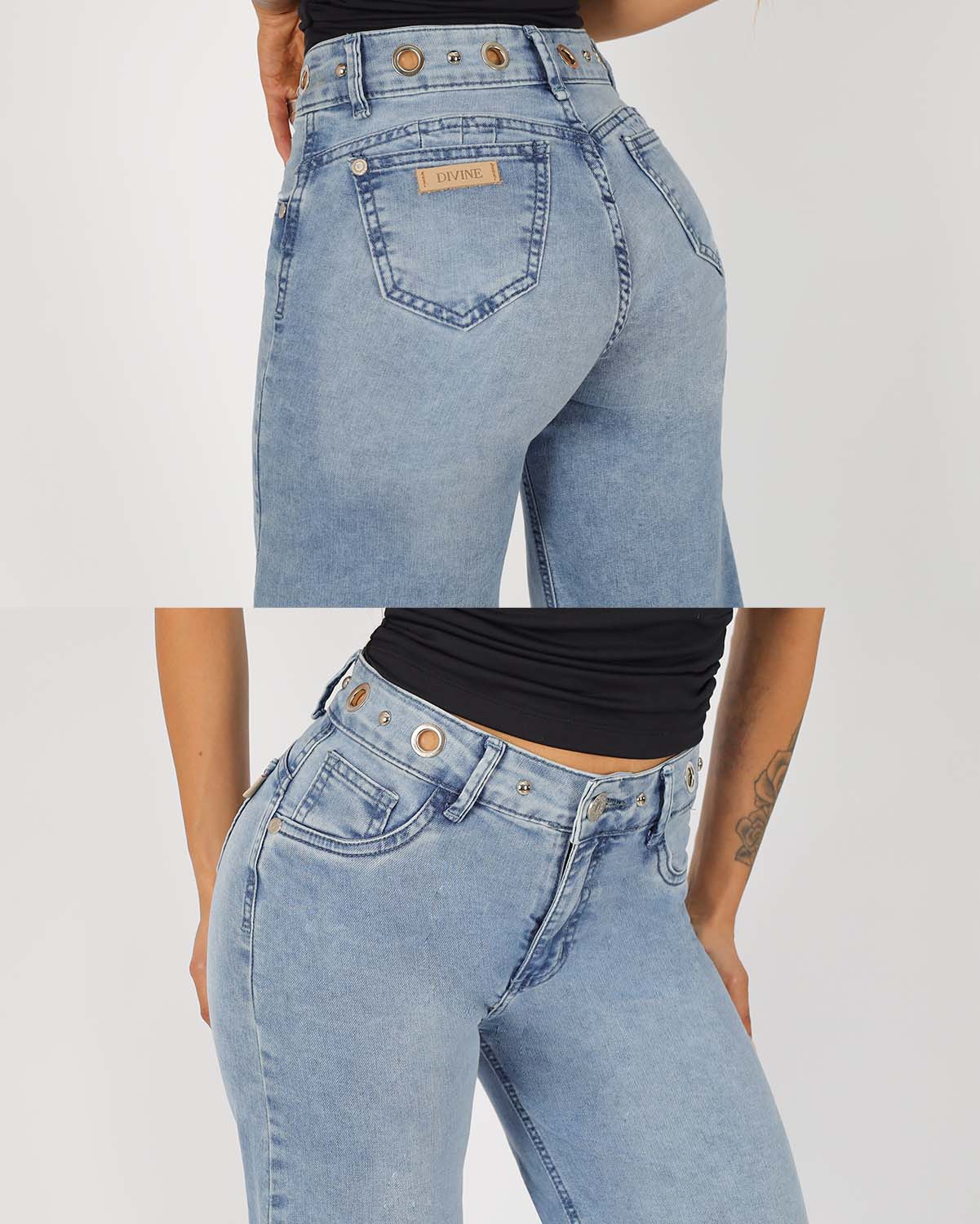 Jeans wide leg en tono celeste, ideal para un look moderno y con personalidad. Su diseño se destaca por los ojetillos y tachas en la pretina, que aportan un estilo urbano y sofisticado. El corte amplio estiliza la silueta y brinda máxima comodidad, convirtiéndolo en una prenda clave para outfits tanto casuales como más trendy.