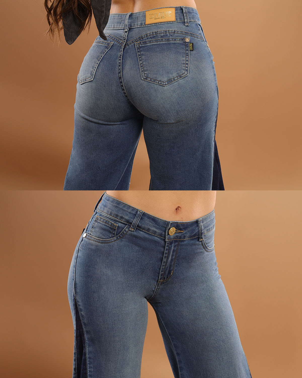 Atrévete a destacar con nuestro jeans pierna ancha en tono celeste con franjas azul profundo en los costados. Un diseño moderno que estiliza tu figura y combina con todo.