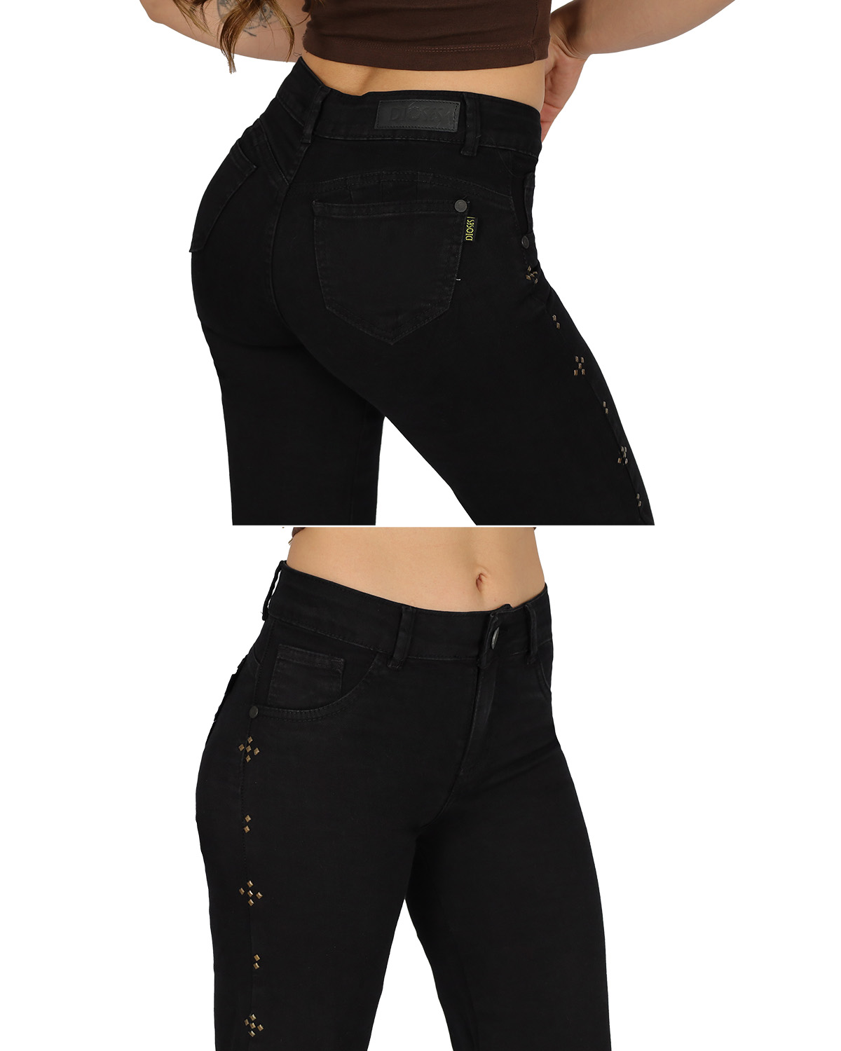 Jeans negro con tachas doradas en los costados.